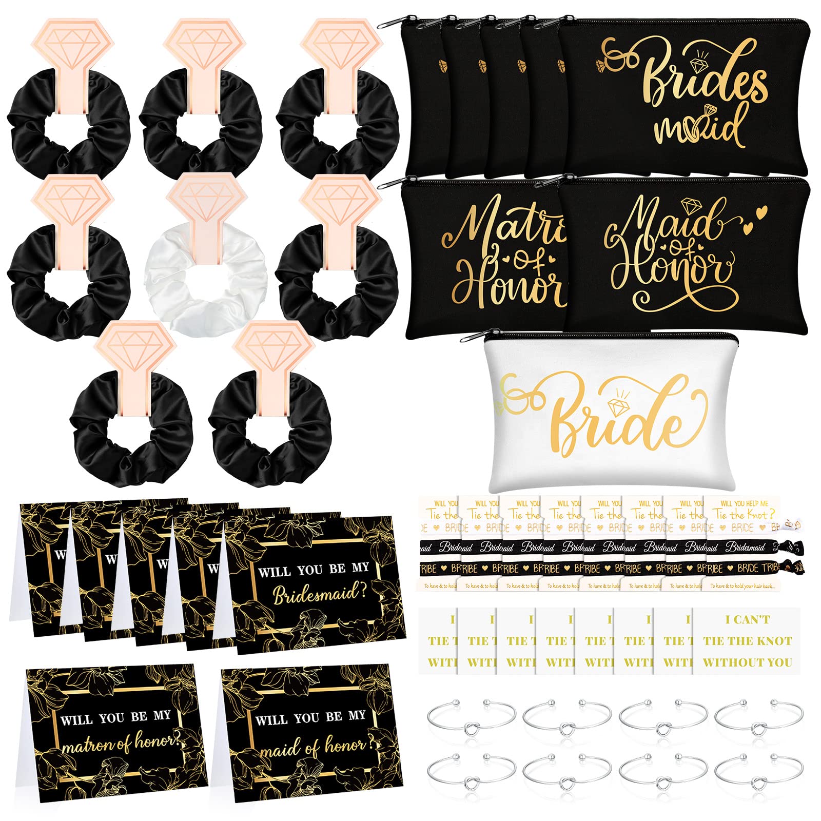 - Maid of Honor Proposal Gift Set: package includes 8 x bridesmaid scrunchie (7 scrunchies for bridesmaid,1 pack white bridal satin hair ties) , 8 x cosmetic travel makeup bag ( 5 x bridesmaid makeup bag, 1 x brides cosmetic bag,1 x maid of honor cosmetic bag, 1 x matron of honor cosmetic bag), 24 x bridesmaid hairband, 8 x bridesmaid knotted bracelets, 7 x bridesmaid invitation card, 8 x bridesmaid card, good combination for your bachelorette party bridal shower, let you shine at any time