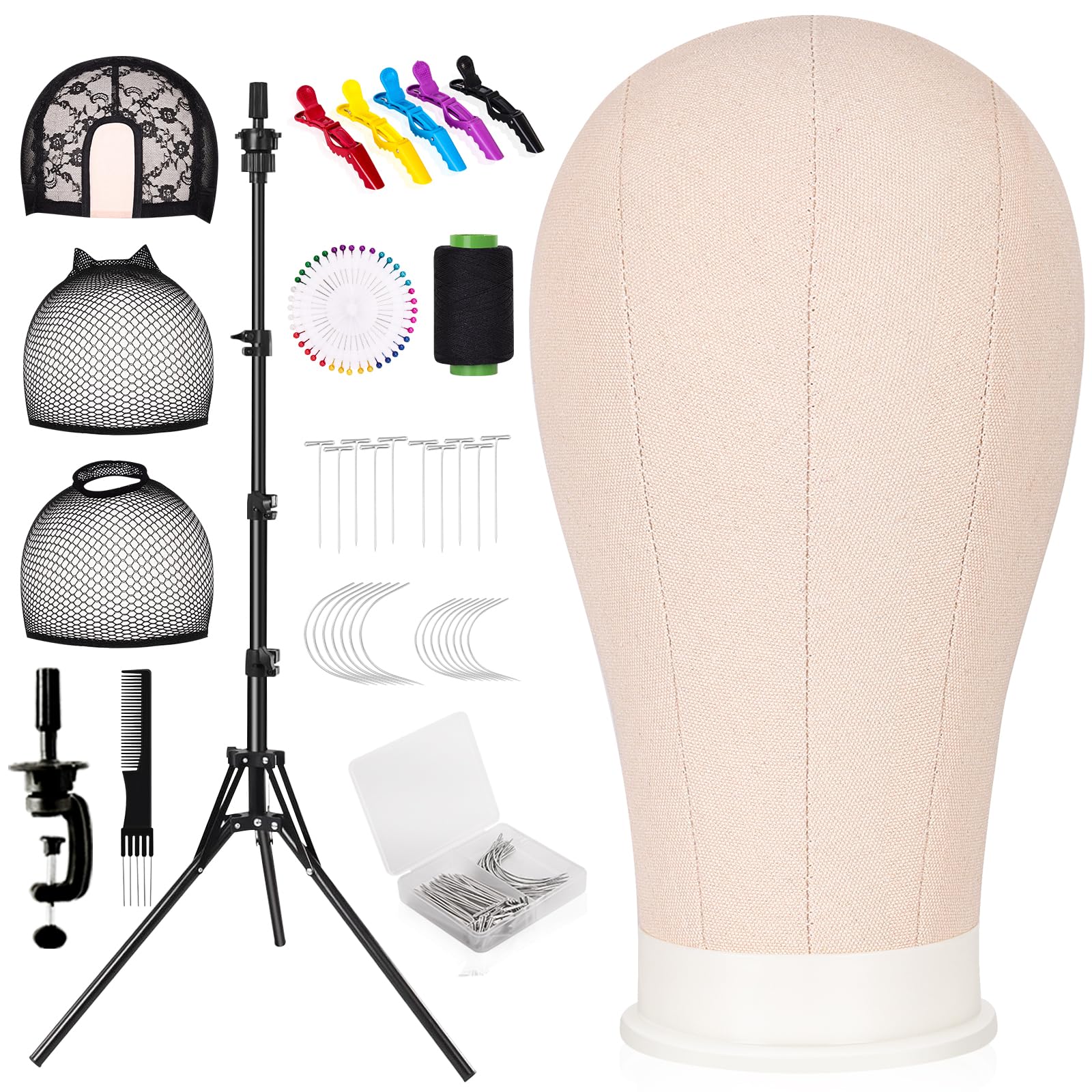 - 【Practical Accessories】Mcwdoit wig mannequin head with stand set includes 3pcs wig caps, 1pc wig sewing thread, 50pcs T pins, 10pcs 2.5'' C-type pins, 10pcs 3'' C-type pins, 40pcs straight pins, 5pcs duckbill clips and 1pc brush