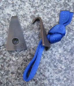 Logan Hooks provide superior hooking action on small edges (wide) or divots and bat hook holes (pointed). The Pointer Logan Hook in use webbing attachment hole provides a connection point that is close to the rock. The result is the majority of the climbers weight is not transferred into outward leverage. The Pointed Logan Hook Pointed Logan Hook Tip now features a narrowed section behind the tip. The narrow section allows for greater reach into bat hook holes and blown out rivet placements. Both hooks use a stable tripod design. Sling with 9/16? Supertape or 1/2? tie-off webbing.