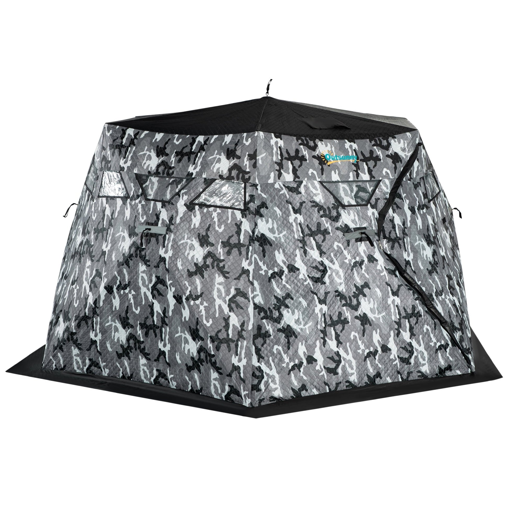 With a warm design, this tent for fishing ensures that weather down to -22#??/-30#?? is a scenario you're ready for. The 360 degree view opens up your world with 14 windows that have no dead zones and offer wide, surrounding coverage. In minutes, your prep is over, so fishing time comes right away. Quick speeds reduce the wait times you don't need to waste your trip on. Travel with the tent backpack style or shoulder-carry style. This fish tent pod from Outsunny keeps in warmth.Features: Warm interior with temperature protection down to -22a??/-30a?? Speedy-quick set-up provides instant and effortless prep Easy to carry in portable bag with straps for backpack or shoulder carrying Built for 3-4 People Double doors make it easy for more than one person to enter and exit at once, making it easier to share the space Use a mesh pocket for safekeeping and easy reach to small items Includes ground stakes and guy ropes to add stability Specifications: Color: Black, White, and Gray Camouflage Material: 600D Oxford, Fiberglass Overall Dimensions: 141.75' L x 141.75' W x 76.75' H, 70.75'' (side) Folded Dimensions: 67.75' L x 13.75' W x 8.75' H Door Dimensions: 23.5' W x 67' H Window Dimensions: 15.75' W x 7.75' H, 21.25' W x 7.75' H Storage Pocket: 13.75' W x 10.25' H Item Label: AB1-013V00MX