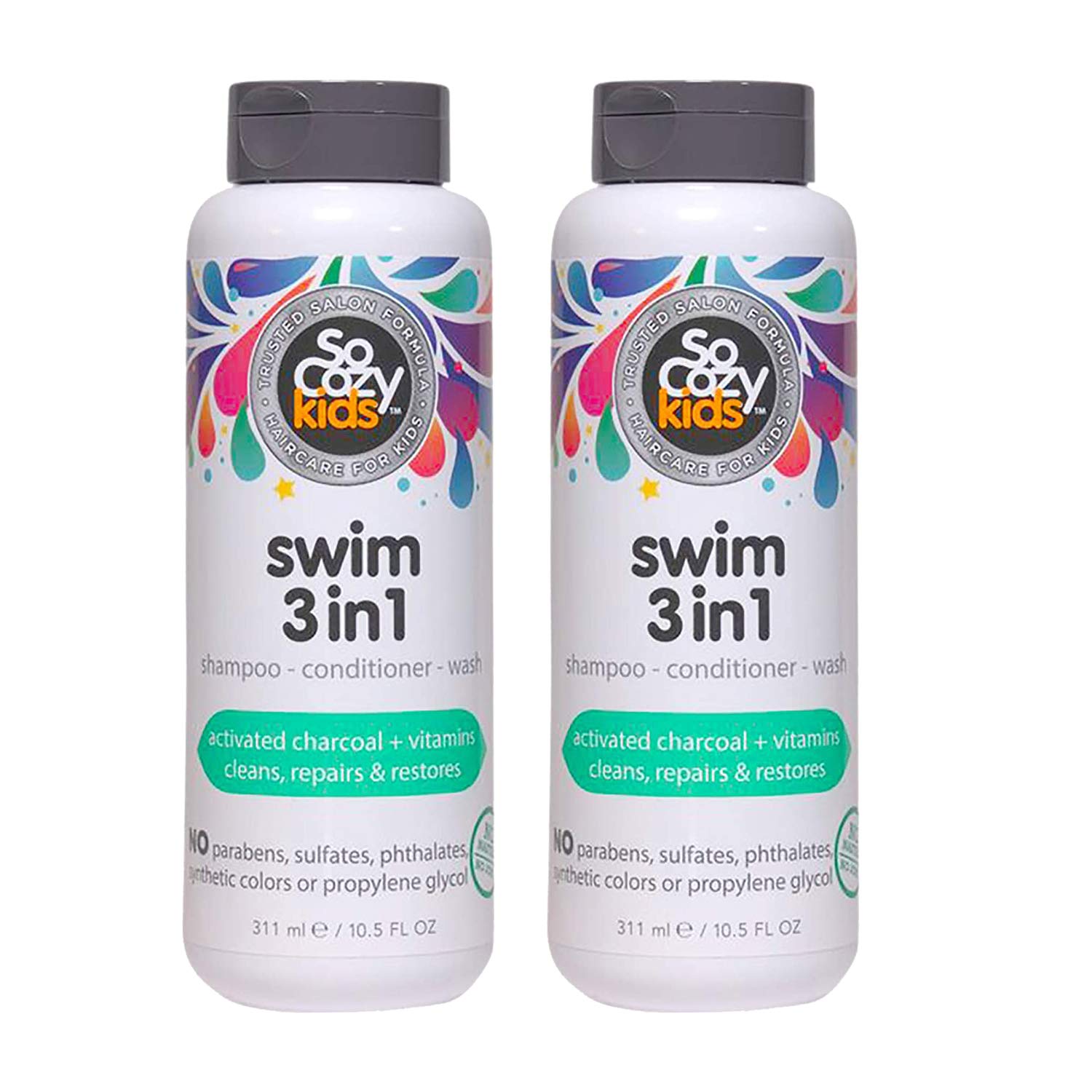So Cozy Kids Swim 3-in-1 Shampoo, Conditioner & Body Wash - 3-in-1 Combo Pool Shampoo & Conditioner for Swimmers - Salt & Chlorine Removing Activated Charcoal, 10.5 Fl oz (Pack Of 2)