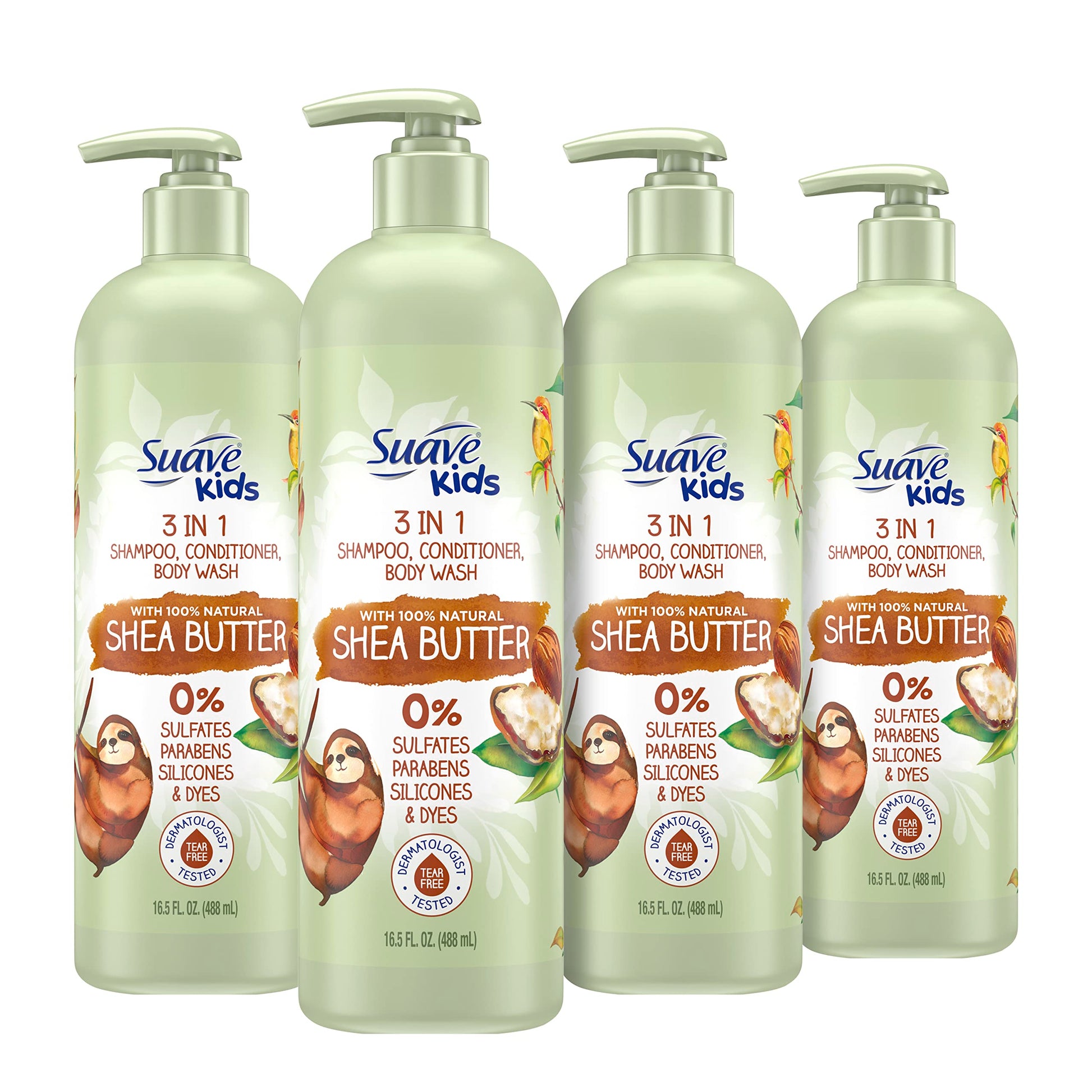 - Suave Kids 3 in 1 Shampoo, Conditioner and Body Wash enriched with 100% natural shea butter is a gentle, nourishing bath-time essential that both parents and kids will love